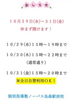 こんにちは。個別指導塾ノーバス烏森駅前校塾長の三浦です。烏森駅前校は10月29日(水)〜31日(金)も休まず開校します!ただし、以下の時間帯を受付時間とさせていただきますので、ご不便をおかけしますがよろしくお願いいたします。29日(水)15時〜19時迄30日(木)15時〜22時迄(通常通り)