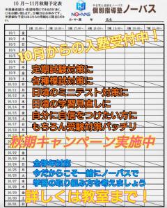 【田島中・内谷中・白幡中・美笹中・笹目中・沼影小・西浦和小・浦和別所小・浦和大里小・美女木小・大東小・浦和西・浦和南・与野高その他近隣の高校の皆さん】 お子様の学習相談や教室のご見学・カウンセリングをまるっと受付中!! 10月入塾 相談実施中!!お問合せは→こちらをクリック 直接は→ノーバス武蔵浦和校TEL:048-866-0330ノーバス武蔵浦和校では、小学生から高校生まで学習できる環境を提供していきます。授業中は先生がずっと隣で教えるから、ひとりひとりの完全オリジナルカリキュラムで成績を上げることができます。先週の中学生から引き続き、高校生も定期試験となりました。早い中学校だと答案が戻ってきつつあります。目標に届いた科目、届かなかった科目。テストまでの期間、学習の進め方はよかったのか、テスト後だからこそ見直し、修正し、実行してみましょう。そして、次の目標点を決めましょうね。本日も多くの生徒が来ていました。そこで少しだけ自習スペースについてご紹介します。自習スペースは、平日と土曜日15:00〜22:00まで利用できます。実は・・・・、通っているお子様のご兄弟・姉妹、ご友人にも自習室を開放しております。また、自習の利用時には@学校の授業や問題集の質問A演習用のプリントの印刷B学習相談 も承っております。様々な学校の生徒が在籍しておりますが、特に上記記載の学校のお子様を多く預かっております。自習時のサポートもしながら、学習習慣のつけ方を実践し、リズムを作りながら、日々の学習を進めています。【小学校】沼影小・西浦和小・浦和別所小・浦和大里小・美女木小・大東小・埼大附属小【中学校】(公立)田島中・内谷中・白幡中・美笹中・笹目中・新曽中・埼大附属中【公立高校】浦和西高・市立浦和南高・蕨高・与野高・南陵高・大宮国際高・大宮南高【私立】細田学園・成立学園・浦和麗明・浦和学院・浦和実業・東京成徳大など 上記以外の学校ももちろん利用可能です。ご利用可能な方はお問い合わせください。また直接教室でも受け付けております。秋の学習しやすい時期になりました。それぞれの目標に向けて、行動あるのみです。今週はお知らせ2つになります。その1《秋期キャンペーン実施中》入塾金&初月授業料最大半額キャンペーン【キャンペーン詳細】 当サイトから資料請求/体験授業のお申込みをいただき、キャンペーン期間中にご入塾いただいた場合、入塾金&初月授業料が最大50%割引となります。※授業料割引は最大50%・上限税込11,000円まで。先着20名様限定でキャンペーン実施中です!! その2《北辰テスト対策イベント》【日時】10/25(土)・11/1(土) 両日ともに 13:30〜17:00 過去問演習 13:30〜14:50 解説 15:00〜17:00北辰テストの過去問を利用し、解きながら疑問を解決する時間を作っています。この時期の中学3年生は普段の学習に追われながら、実力テストに向けての学習をしていますね。そして、しっかり実力テストへの対策ができれば、得点や偏差値がぐんと伸びます。頻繁に出る項目、文章問題の形式などに無策のまま受けても、なかなか点数は伸びません。どのような問題を出してきたのかを把握すれば、対策を立てやすくなります。。そんなところを気付かせるイベントにしています。無料ですので、塾に通っていない方もどうぞお試しに来てください。ノーバス武蔵浦和校 TEL:048-866-0330 平日・土曜日15:00〜21:00 (営業時間外:留守電となりますが、お電話番号・お名前・ご用件を入れて頂ければ、後日改めてご連絡いたします)